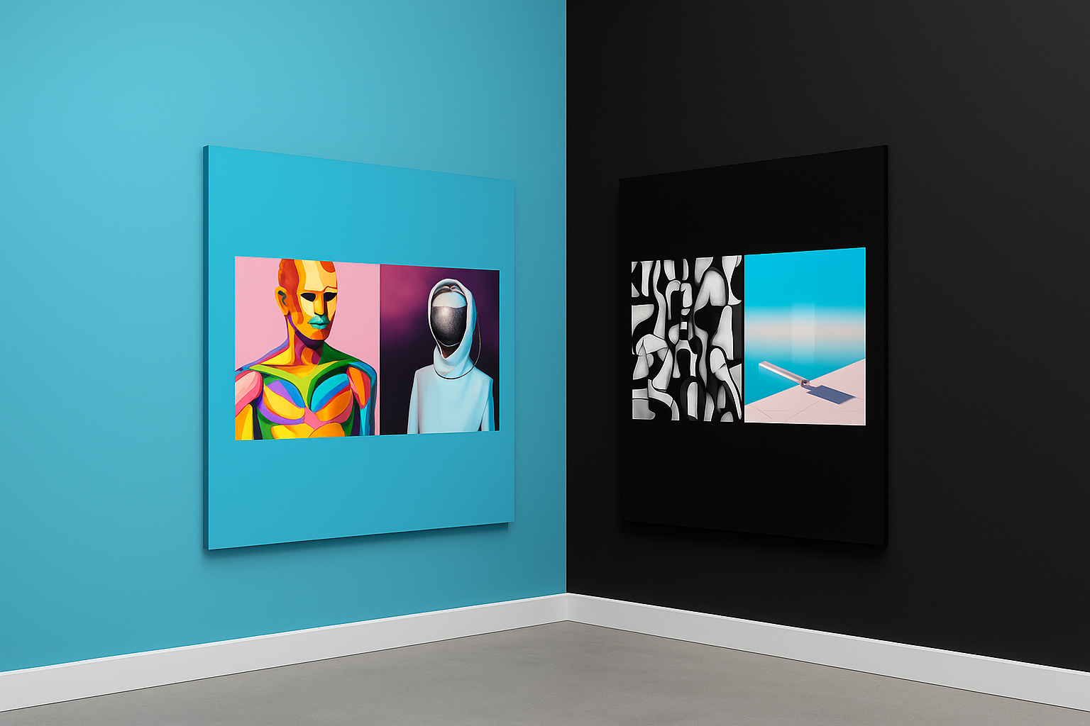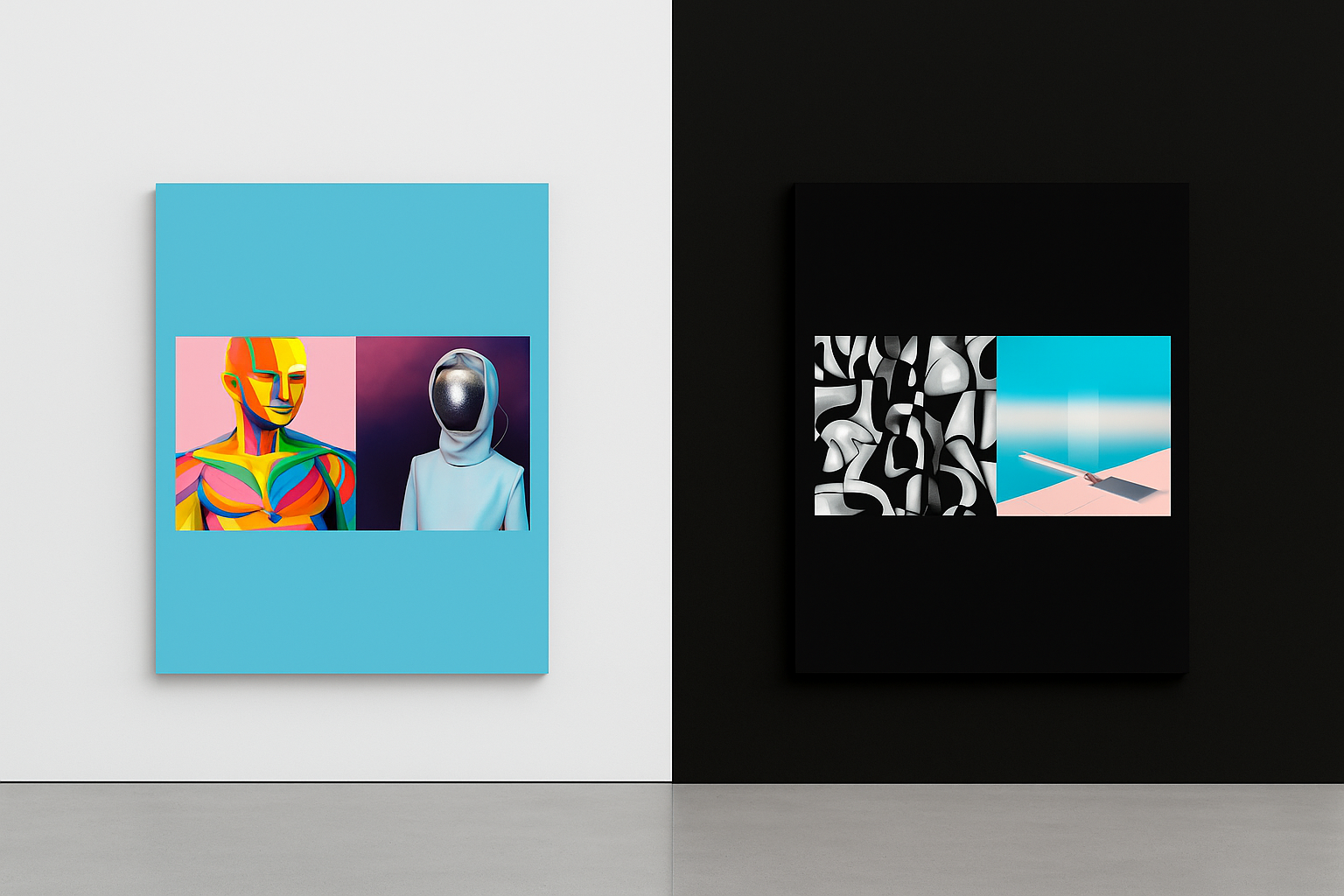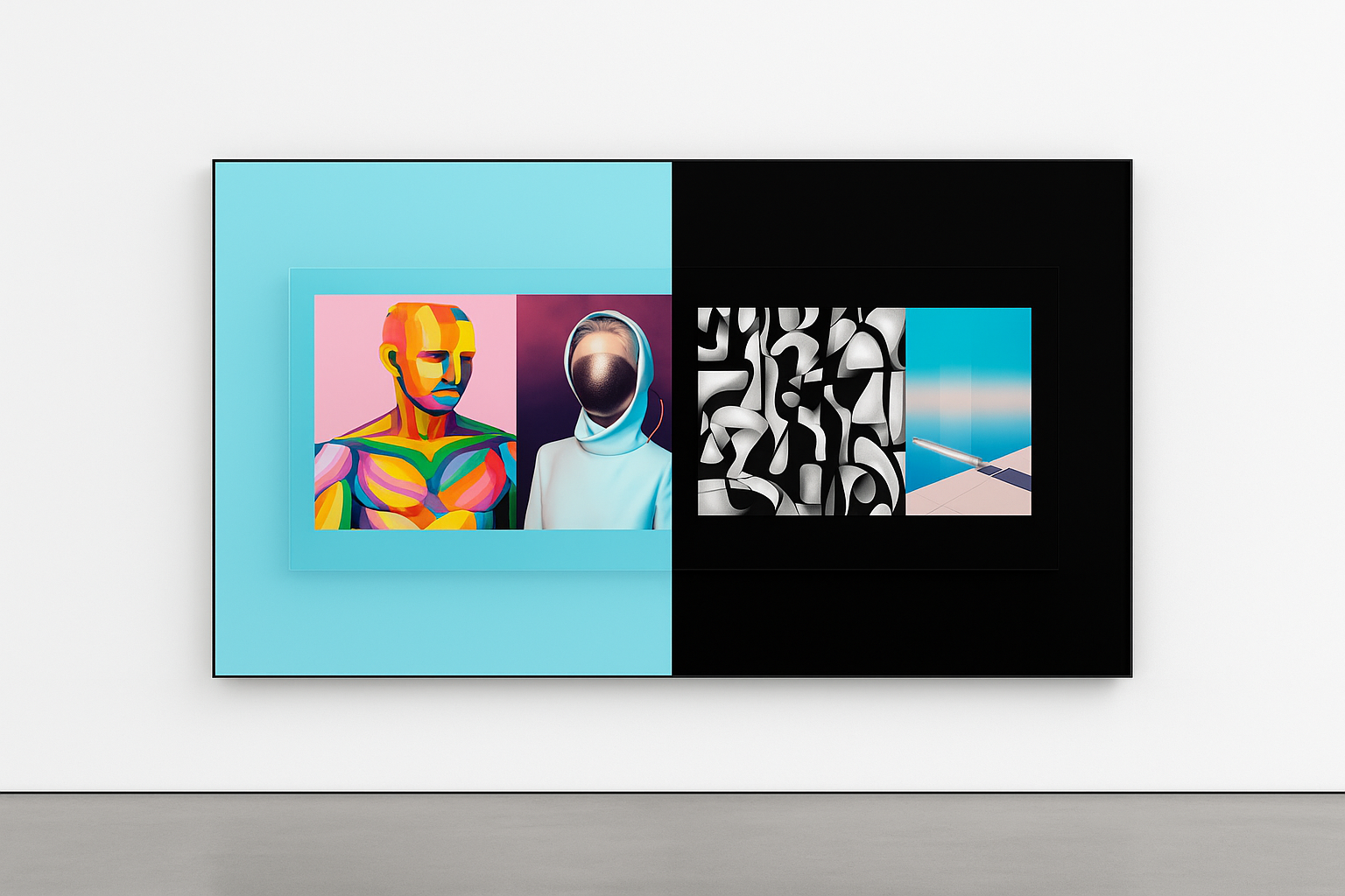 AI contributed to decisions about composition, spatial arrangement and the way the images could be presented as a single exhibition piece.